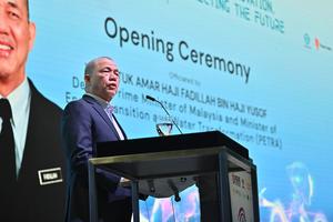 (251125) -- KUALA LUMPUR, 25 noviembre, 2025 (Xinhua) -- El vice primer ministro malasio, Fadillah Yusof (c), también ministro de Transición Energética y Transformación Hídrica de Malasia, habla en la ceremonia inaugural de la Cumbre de Cooperación y Desarrollo Tecnológico de la Asociación de Naciones del Sudeste Asiático (ASEAN) 2025, en Kuala Lumpur, Malasia, el 25 de noviembre de 2025. El enorme potencial de la ASEAN debe aprovecharse para que la región se convierta en un centro global de innovación, tecnología y progreso sostenible, dijo el martes Yusof. (Xinhua/Chong Voon Chung) (jg) (ra) (ce)