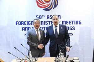 (250710) -- KUALA LUMPUR, 10 julio, 2025 (Xinhua) -- El ministro de Relaciones Exteriores chino, Wang Yi, también miembro del Buró Político del Comité Central del Partido Comunista de China, se reúne con el ministro de Relaciones Exteriores ruso, Sergey Lavrov, en Kuala Lumpur, Malasia, el 10 de julio de 2025. (Xinhua/Cheng Yiheng) (jg) (ah) (ce)