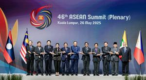 (250526) -- KUALA LUMPUR, 26 mayo, 2025 (Xinhua) -- (De izq. a der.) El primer ministro de Laos, Sonexay Siphandone, el secretario permanente del Ministerio de Asuntos Exteriores de Myanmar, Aung Kyaw Moe, el primer ministro de Singapur, Lawrence Wong, la primera ministra de Tailandia, Paetongtarn Shinawatra, el primer ministro de Vietnam, Pham Minh Chinh, el primer ministro de Malasia, Anwar Ibrahim, el presidente de Filipinas, Ferdinand Romualdez Marcos, el sultán de Brunei, Haji Hassanal Bolkiah, el primer ministro de Camboya, Hun Manet, el presidente de Indonesia, Prabowo Subianto y el primer ministro de Timor Oriental, Xanana Gusmao, posan para una fotografía grupal en la ceremonia de apertura de la sesión plenaria de la 46ª Cumbre de la ASEAN, en Kuala Lumpur, Malasia, el 26 de mayo de 2025. La 46ª Cumbre de la ASEAN comenzó el lunes en la capital de Malasia, con una mayor integración regional y la resiliencia contra las perturbaciones comerciales y económicas como puntos principales de la agenda. (Xinhua/Ma Ping) (rtg) (ah) (ce)