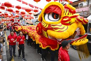 (250123) -- MALACA, 23 enero, 2025 (Xinhua) -- Imagen del 21 de enero de 2025 de personas realizando la danza del león en la calle Jonker, en Malaca, Malasia. Cerca de 100 personas realizaron la danza del león aquí el martes para celebrar el próximo Festival de Primavera. (Xinhu/Chong Voon Chung) (rtg) (ra) (ce)