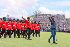 (251005) -- BLANTYRE, 5 octubre, 2025 (Xinhua) -- Imagen del 4 de octubre de 2025 de un desfile militar llevado a cabo durante una ceremonia de juramentación en el Estadio Kamuzu, en Blantyre, Malaui. El presidente Peter Mutharika, de 85 años de edad, que ya ocupó el cargo de 2014 a 2020, volvió a la presidencia con la expresidenta de la Comisión Electoral de Malaui, Jane Ansah, como vicepresidenta. (Xinhua/Roy Nkosi) (rtg) (ah)