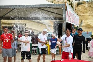(250525) — BIRGU, 25 mayo, 2025 (Xinhua) — Imagen del 24 de mayo de 2025 de personas festejando al término de la primera carrera amistosa de botes del dragón de la Copa Duanwu, en Birgu, Malta. La carrera de botes dragón se celebró el sábado en la histórica ciudad de Birgu, en el este de Malta, para conmemorar el tradicional Festival de Botes Dragón chino. También conocido como Festival Duanwu, el Festival del Bote del Dragón se celebra el quinto día del quinto mes del calendario lunar chino. Este año cae el 31 de mayo. El acto fue organizado conjuntamente por el Centro Cultural Chino de Malta, el Club de Regatas de Birgu, la Cámara de Comercio Chino-Maltesa y la Asociación de la Comunidad China de Malta. (Xinhua/Jonathan Borg) (oa) (ah)