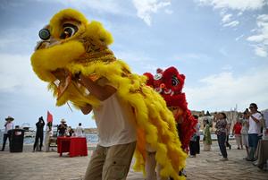 (250525) -- BIRGU, 25 mayo, 2025 (Xinhua) -- Imagen del 24 de mayo de 2025 de una presentación de la danza del león durante la primera carrera amistosa de botes del dragón de la Copa Duanwu, en Birgu, Malta. La carrera de botes dragón se celebró el sábado en la histórica ciudad de Birgu, en el este de Malta, para conmemorar el tradicional Festival de Botes Dragón chino. También conocido como Festival Duanwu, el Festival del Bote del Dragón se celebra el quinto día del quinto mes del calendario lunar chino. Este año cae el 31 de mayo. El acto fue organizado conjuntamente por el Centro Cultural Chino de Malta, el Club de Regatas de Birgu, la Cámara de Comercio Chino-Maltesa y la Asociación de la Comunidad China de Malta. (Xinhua/Jonathan Borg) (oa) (ah)
