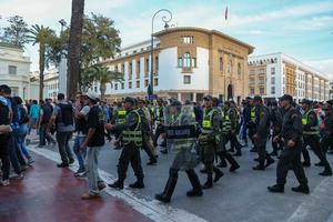 (250929) — RABAT, 29 septiembre, 2025 (Xinhua) — Imagen del 28 de septiembre de 2025 de la policía y las fuerzas de seguridad vistas durante una manifestación para exigir mejores servicios públicos, en Rabat, Marruecos. Jóvenes salieron a las calles del centro de Rabat el domingo y pidieron una reforma de los sectores de la educación y la salud. (Xinhua/Huo Jing) (oa) (ah) (ce)