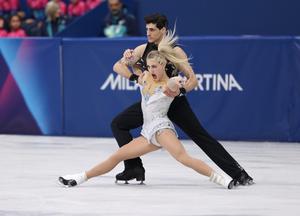 (260210) — MILAN, 10 febrero, 2026 (Xinhua) — Imagen del 9 de febrero de 2026 de Lilah Fear (d)/Lewis Gibson, de Reino Unido, presentándose durante la danza rítmica de la competencia de danza sobre hielo de patinaje artístico en los Juegos Olímpicos de Invierno Milán-Cortina 2026, en Milán, Italia. (Xinhua/Xue Yuge) (jg) (ra) (vf)