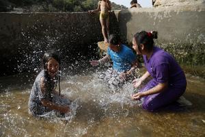 (250813) -- BELEN, 13 agosto, 2025 (Xinhua) -- Imagen del 12 de agosto de 2025 de palestinos jugando en las aguas de un manantial natural en medio de una ola de calor de verano, en la aldea de Battir, en el oeste de Belén, en el sur de Cisjordania. (Xinhua/Mamoun Wazwaz) (ah) (ra) (ce)