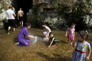 (250813) -- BELEN, 13 agosto, 2025 (Xinhua) -- Imagen del 12 de agosto de 2025 de palestinos jugando en las aguas de un manantial natural en medio de una ola de calor de verano, en la aldea de Battir, en el oeste de Belén, en el sur de Cisjordania. (Xinhua/Mamoun Wazwaz) (ah) (ra) (ce)