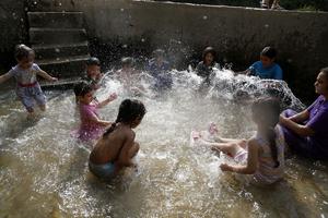 (250813) -- BELEN, 13 agosto, 2025 (Xinhua) -- Imagen del 12 de agosto de 2025 de palestinos jugando en las aguas de un manantial natural en medio de una ola de calor de verano, en la aldea de Battir, en el oeste de Belén, en el sur de Cisjordania. (Xinhua/Mamoun Wazwaz) (ah) (ra) (ce)