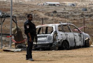 (250802) -- HEBRON, 2 agosto, 2025 (Xinhua) -- Imagen del 1 de agosto de 2025 de un policía visto en el sitio de un vehículo quemado por colonos israelíes, en la aldea de Susiya de Hebrón, en el sur de Cisjordania. (Xinhua/Mamoun Wazwaz) (oa) (da)