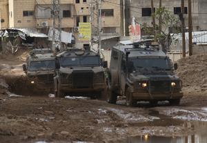 (250224) -- JENIN, 24 febrero, 2025 (Xinhua) -- Vehículos militares israelíes son vistos durante un operativo militar, en la ciudad cisjordana de Jenin, el 24 de febrero de 2025. El ministro de Defensa israelí, Israel Katz, ordenó el domingo a los militares que se preparen para una presencia de un año en los campamentos de refugiados de Cisjordania, a medida que Israel intensifica su campaña militar a gran escala en el territorio palestino ocupado. (Xinhua/Nidal Eshtayeh) (rtg) (ah) (vf)