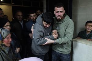 (260315) -- NAPLUSA, 15 marzo, 2026 (Xinhua) -- Imagen del 14 de marzo de 2026 de palestinos lamentándose por la muerte de un hombre palestino asesinado por la violencia de los colonos israelíes, en un hospital en Naplusa, en el norte de Cisjordania. Un palestino murió y otros tres resultaron heridos el sábado tras un ataque perpetrado por colonos israelíes en el norte de Cisjordania, según la Sociedad de la Media Luna Roja Palestina y funcionarios locales. (Xinhua/Nidal Eshtayeh) (da) (ah) (ce)