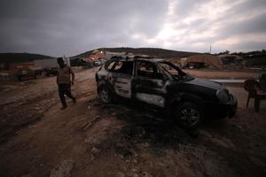 (251112) -- TULKARM, 12 noviembre, 2025 (Xinhua) -- Imagen del 11 de noviembre de 2025 de un palestino caminando frente a un vehículo quemado por un incendio provocado por colonos israelíes cerca del poblado de Beit Lid, en el este de Tulkarm, en el norte de Cisjordania. Colonos israelíes atacaron el martes instalaciones industriales y agrícolas cerca del poblado de Beit Lid, en el este de Tulkarm, provocando grandes incendios e hiriendo a varios palestinos, según la agencia oficial de noticias palestina WAFA. (Xinhua/Nidal Eshtayeh) (ah) (ra) (ce)
