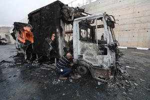 (251112) — TULKARM, 12 noviembre, 2025 (Xinhua) — Imagen del 11 de noviembre de 2025 de un palestino revisando un vehículo quemado por un incendio provocado por colonos israelíes cerca del poblado de Beit Lid, en el este de Tulkarm, en el norte de Cisjordania. Colonos israelíes atacaron el martes instalaciones industriales y agrícolas cerca del poblado de Beit Lid, en el este de Tulkarm, provocando grandes incendios e hiriendo a varios palestinos, según la agencia oficial de noticias palestina WAFA. (Xinhua/Nidal Eshtayeh) (ah) (ra) (ce)