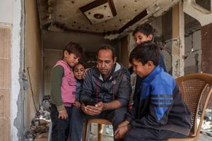 (250429) -- GAZA, 29 abril, 2025 (Xinhua) -- Imagen del 28 de abril de 2025 de Akram Abu Khosa, un agricultor palestino de 49 años de edad, y sus hijos vistos en su vivienda dañada, en Tal al-Hawa, en el oeste de la Ciudad de Gaza. En Tal al-Hawa, Akram Abu Khosa suele sentarse en silencio en su balcón. Con su teléfono inteligente en la mano, revisa fotografías y videos de sus alguna vez vibrantes campos de fresas. "Hace apenas dos años, cada mañana respiraba el aire fresco entre los campos. Pero ahora, me veo obligado a observar la devastación que me rodea y recordar mi granja solo a través de videos y fotografías", dijo a Xinhua el padre de seis hijos. (Xinhua/Rizek Abdeljawad) (jg) (ra) (ce)