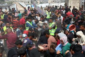 (250502) -- GAZA, 2 mayo, 2025 (Xinhua) -- Palestinos reciben alimentos gratuitos de un centro de distribución de alimentos, en la Ciudad de Gaza, el 2 de mayo de 2025. La Agencia de las Naciones Unidas para los Refugiados de Palestina en Oriente Próximo dijo el viernes que el actual bloqueo israelí está agravando la situación humanitaria en la Franja de Gaza, afectando particularmente a mujeres y niños. (Xinhua/Rizek Abdeljawad) (jg) (da) (ce)