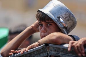 (250803) -- GAZA, 3 agosto, 2025 (Xinhua) -- Imagen del 2 de agosto de 2025 de un niño palestino esperando para recibir alimentos gratuitos de un centro de distribución de alimentos, en la Ciudad de Gaza. (Xinhua/Rizek Abdeljawad) (oa) (ah)