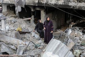 (250626) -- GAZA, 26 junio, 2025 (Xinhua) -- Palestinas son vistas entre los escombros de un edificio destruido tras un ataque aéreo israelí en el campamento de refugiados de Shati, en el oeste de la Ciudad de Gaza, el 26 de junio de 2025. (Xinhua/Rizek Abdeljawad) (jg) (da) (ce)