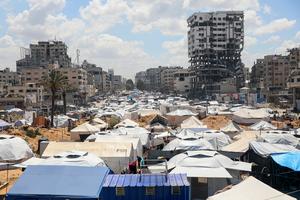(250417) -- GAZA, 17 abril, 2025 (Xinhua) -- Imagen del 15 de abril de 2025 de tiendas de campañas en un refugio temporal, en la Ciudad de Gaza. Las autoridades de Salud de Gaza anunciaron el miércoles que al menos 25 personas murieron y otras 89 resultaron heridas en Gaza en las últimas 24 horas. (Xinhua/Rizek Abdeljawad) (da) (ra) (ce)