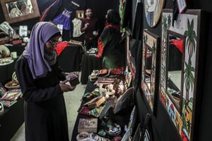 (251205) -- CIUDAD DE GAZA, 5 diciembre, 2025 (Xinhua) -- Imagen del 4 de diciembre de 2025 de una mujer visitando el "Bazar de la Esperanza" que exhibe artesanías hechas a mano por palestinos con discapacidades, en la Ciudad de Gaza. (Xinhua/Rizek Abdeljawad) (jg) (da) (vf)