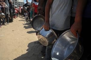 (250528) -- GAZA, 28 mayo, 2025 (Xinhua) -- Palestinos esperan para recibir comida gratuita en un centro de distribución de alimentos en el campamento de refugiados de al-Shati, en el oeste de la Ciudad de Gaza, el 28 de mayo de 2025. (Xinhua/Rizek Abdeljawad) (ah) (vf)
