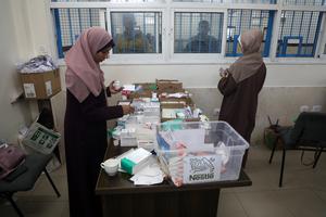 (250428) -- CIUDAD DE GAZA, 28 abril, 2025 (Xinhua) -- Palestinas trabajan en un centro de salud de la Agencia de Naciones Unidas para los Refugiados de Palestina en Oriente Próximo, en medio de una escasez de medicamentos debido al continuo cierre por parte de Israel de los cruces fronterizos de la Franja de Gaza, en el oeste de la Ciudad de Gaza, el 28 de abril de 2025. (Xinhua/Rizek Abdeljawad) (oa) (ah) (vf)