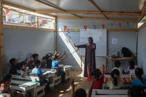 (250526) -- GAZA, 26 mayo, 2025 (Xinhua) -- Imagen del 25 de mayo de 2025 de estudiantes palestinos vistos en un aula improvisada dentro de una tienda de campaña, en el centro de la Ciudad de Gaza. (Xinhua/Rizek Abdeljawad) (oa) (ah) (vf)