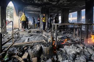 (250423) -- GAZA, 23 abril, 2025 (Xinhua) -- Palestinos son vistos en una escuela tras un ataque aéreo israelí, en la Ciudad de Gaza, el 23 de abril de 2025. La agencia de seguridad interna israelí Shin Bet y el Ejército informaron el miércoles que un mortífero ataque aéreo nocturno contra una escuela que albergaba a familias desplazadas en el norte de Gaza iba dirigido contra militantes. Las autoridades sanitarias de Gaza informaron que el ataque causó la muerte de al menos 10 personas y provocó incendios en tiendas de campaña y aulas de la escuela. (Xinhua/Rizek Abdeljawad) (jg) (da) (vf)