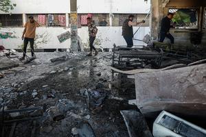 (250425) -- GAZA, 25 abril, 2025 (Xinhua) -- Palestinos inspeccionan los daños en una escuela que alberga a personas desplazadas después de un ataque aéreo israelí, en la Ciudad de Gaza, el 25 de abril de 2025. Al menos 21 palestinos murieron el viernes en ataques aéreos israelíes en toda la Franja de Gaza, según las autoridades de la Defensa Civil de Gaza. (Xinhua/Rizek Abdeljawad) (oa) (ra) (vf)