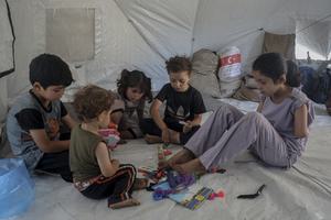 (250710) -- GAZA, 10 julio, 2025 (Xinhua) -- Imagen del 29 de junio de 2025 de Sara al-Borsh jugando con otros niños en su tienda de campaña familiar en el vecindario de Sheikh Radwan, en la Ciudad de Gaza. En el suelo polvoriento de una tienda de campaña improvisada en el vecindario de Sheikh Radwan de la ciudad de Gaza, Sara al-Borsh, de 10 años de edad, aferra un bolígrafo entre sus dedos de los pies, dibujando cuidadosamente una mariposa en el reverso de una hoja reciclada de un cuaderno. Hace apenas unos meses, dibujaba con las manos, soñando con ser pediatra. Pero un ataque aéreo israelí en octubre de 2024 destrozó esos sueños, junto con sus brazos y la vida de su padre. (Xinhua/Rizek Abdeljawad) (da) (ra) (vf)