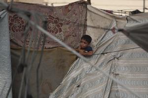 (250624) -- GAZA, 24 junio, 2025 (Xinhua) -- Imagen del 23 de junio de 2025 de un niño palestino desplazado visto en un refugio temporal, en la Ciudad de Gaza. (Xinhua/Mahmoud Zaki) (jg) (ra) (ce)