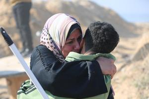 (250127) -- GAZA, 27 enero, 2025 (Xinhua) -- Personas desplazadas de camino a casa se abrazan entre ellos, en la Ciudad de Gaza, el 27 de enero de 2025. Decenas de miles de palestinos comenzaron a regresar el lunes a sus hogares en la Ciudad de Gaza y las partes norte del enclave costero después de 15 meses de desplazamiento forzado. (Xinhua/Abdul Rahman Salama) (oa) (ah) (ce)