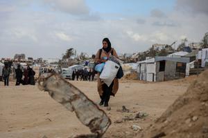 (250321) -- CIUDAD DE GAZA, 21 marzo, 2025 (Xinhua) -- Imagen del 20 de marzo de 2025 de una mujer palestina forzada a huir del poblado de Beit Lahia, en el norte de la Franja de Gaza, por el Ejército israelí, vista en la Ciudad de Gaza. (Xinhua/Rizek Abdeljawad) (rtg) (ra) (ce)