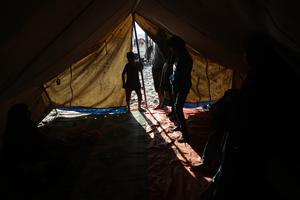 (250521) -- GAZA, 21 mayo, 2025 (Xinhua) -- Personas desplazadas son vistas dentro de una tienda de campaña en la zona del puerto marítimo del oeste de la Ciudad de Gaza, el 21 de mayo de 2025. El presidente palestino, Mahmoud Abbas, pidió el miércoles a la comunidad internacional que tome medidas inmediatas en respuesta a la situación "catastrófica y trágica" en la Franja de Gaza. (Xinhua/Rizek Abdeljawad) (ra) (vf)