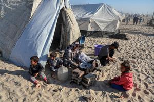 (250521) -- GAZA, 21 mayo, 2025 (Xinhua) -- Personas desplazadas preparan alimentos en un refugio temporal en la zona del puerto marítimo del oeste de la Ciudad de Gaza, el 21 de mayo de 2025. El presidente palestino, Mahmoud Abbas, pidió el miércoles a la comunidad internacional que tome medidas inmediatas en respuesta a la situación "catastrófica y trágica" en la Franja de Gaza. (Xinhua/Rizek Abdeljawad) (ra) (vf)