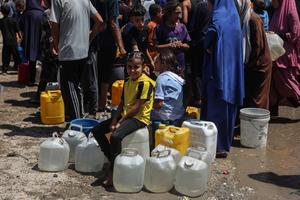 (250802) -- GAZA, 2 agosto, 2025 (Xinhua) -- Imagen del 1 de agosto de 2025 de niños palestinos desplazados esperando para recolectar agua en un refugio temporal, en la Ciudad de Gaza. (Xinhua/Rizek Abdeljawad) (oa) (da)