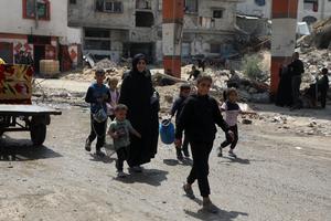 (250403) -- GAZA, 3 abril, 2025 (Xinhua) -- Palestinos que huyen del barrio de Shuja'iyya son vistos en la Ciudad de Gaza, el 3 de abril de 2025. El Ejército israelí pidió a los residentes de algunas áreas del este de la Ciudad de Gaza evacuar y dirigirse a refugios en el oeste de la ciudad. En un comunicado, el portavoz militar israelí, Avichay Adraee, emitió una "advertencia seria y urgente" a los residentes del área de Shuja'iyya y otros barrios. (Xinhua/Rizek Abdeljawad) (jg) (ah) (ce)