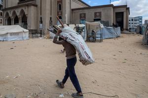 (250412) -- GAZA, 12 abril, 2025 (Xinhua) -- Imagen del 11 de abril de 2025 de un palestino desplazado transportando materiales en la Universidad Islámica de Gaza, que resultó dañada por un bombardeo israelí, en la Ciudad de Gaza. La Universidad Islámica de Gaza, una de las universidades más grandes de la Franja de Gaza, se ha convertido ahora en un refugio para cientos de familias palestinas. (Xinhua/Rizek Abdeljawad) (jg) (da)