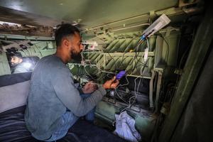 (251203) -- GAZA, 3 diciembre, 2025 (Xinhua) -- Imagen del 30 de noviembre de 2025 de palestinos usando una fuente de energía dentro de un vehículo abandonado del Ejército israelí, en la Ciudad de Gaza. Entre los escombros del barrio de Tel al-Hawa, en el suroeste de la Ciudad de Gaza, un vehículo blindado israelí abandonado cumple ahora una función inesperada, cubierto con un cartel de tela roja en el que se lee "Estación de Carga", se ha convertido en una rara fuente de energía en una zona sumida en la oscuridad tras más de dos años de conflicto. (Xinhua/Rizek Abdeljawad) (jg) (da) (vf)
