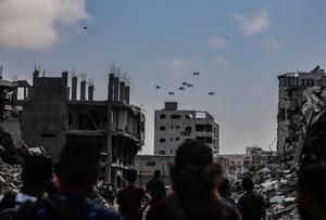 (250809) — GAZA, 9 agosto, 2025 (Xinhua) — Imagen del 8 de agosto de 2025 de ayuda humanitaria lanzada desde el aire sobre la Ciudad de Gaza. (Xinhua/Rizek Abdeljawad) (oa) (da)