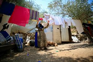(250819) -- BEIRUT, 19 agosto, 2025 (Xinhua) -- Imagen del 14 de agosto de 2025 de una mujer siria desplazada colgando ropa en un campamento de refugiados, en Ketermaya, Líbano. Mientras el martes se conmemora el Día Mundial de la Asistencia Humanitaria en todos los países, Medio Oriente y el Norte de Africa siguen sumidos en algunas de las crisis más graves del mundo, especialmente en el ámbito humanitario. (Xinhua/Ali Hashisho) (jg) (ra) (vf)