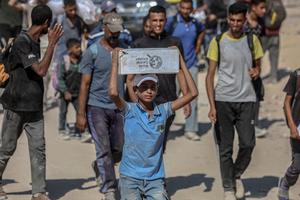 (250806) -- GAZA, 6 agosto, 2025 (Xinhua) -- Imagen del 5 de agosto de 2025 de un niño palestino recolectando ayuda humanitaria, en Beit Lahia, en el norte de la Franja de Gaza. (Xinhua/Rizek Abdeljawad) (jg) (da) (ce)