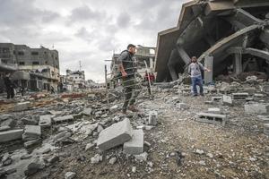 (250413) -- GAZA, 13 abril, 2025 (Xinhua) -- Imagen del 12 de abril de 2025 de palestinos vistos entre los escombros de un edificio destruido después de un ataque aéreo israelí, en el campamento de refugiados de Jabalia, en el norte de la Franja de Gaza. Al menos 1.563 palestinos han perdido la vida y 4.004 más han resultado heridos desde que Israel reanudó sus intensos bombardeos en la Franja de Gaza el 18 de marzo, señalaron el sábado las autoridades de salud de Gaza. (Xinhua/Mahmoud Zaki) (rtg) (da)