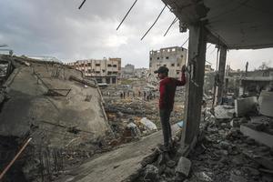 (250413) -- GAZA, 13 abril, 2025 (Xinhua) -- Imagen del 12 de abril de 2025 de un palestino observando edificios destruidos después de un ataque aéreo israelí, en el campamento de refugiados de Jabalia, en el norte de la Franja de Gaza. Al menos 1.563 palestinos han perdido la vida y 4.004 más han resultado heridos desde que Israel reanudó sus intensos bombardeos en la Franja de Gaza el 18 de marzo, señalaron el sábado las autoridades de salud de Gaza. (Xinhua/Mahmoud Zaki) (rtg) (da)