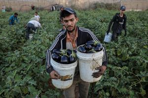 (251008) -- GAZA, 8 octubre, 2025 (Xinhua) -- Agricultores palestinos cosechan berenjenas en una granja, en Deir al-Balah, en el centro de la Franja de Gaza, el 8 de octubre de 2025. Los agricultores continúan cosechando a pesar de la escasez de recursos y las graves dificultades para obtener semillas y fertilizantes. (Xinhua/Rizek Abdeljawad) (jg) (da) (vf)