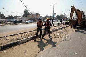 (251110) -- GAZA, 10 noviembre, 2025 (Xinhua) -- Imagen del 5 de noviembre de 2025 de trabajadores palestinos del sector eléctrico reparando líneas eléctricas, en Deir al-Balah, en el centro de la Franja de Gaza. Según la Compañía de Distribución de Electricidad de Gaza, el enclave ha perdido alrededor de 1.200 millones de kilovatios-hora de energía desde que comenzó la guerra. (Xinhua/Rizek Abdeljawad) (oa) (ah) (ce)
