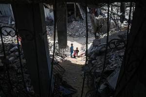 (250428) — JABALIA, 28 abril, 2025 (Xinhua) — Imagen del 27 de abril de 2025 de niños vistos entre los escombros de edificios destruidos, en la zona de Jabalia, en el norte de la Franja de Gaza. (Xinhua/Rizek Abdeljawad) (oa) (ah) (ce)