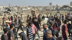 (250527) — GAZA, 27 mayo, 2025 (Xinhua) — Imagen tomada con un teléfono móvil el 27 de mayo de 2025 de palestinos tras recibir ayuda humanitaria de un centro de distribución, en Rafah, en el sur de la Franja de Gaza. Miles de palestinos se aglomeraron el martes en un centro de distribución de ayuda humanitaria en Rafah, desatando el caos y la alteración del orden en el primer día de operaciones del centro bajo supervisión militar israelí, informaron a Xinhua testigos y fuentes palestinas. (Xinhua/Rizek Abdeljawad) (jg) (ra) (vf)