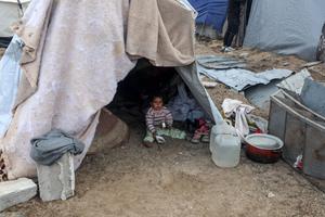 (250205) -- GAZA, 5 febrero, 2025 (Xinhua) -- Una niña palestina es vista en una tienda de campaña que sirve como refugio temporal en el estadio Al-Yarmouk, en la Ciudad de Gaza, el 5 de febrero de 2025. (Xinhua/Rizek Abdeljawad) (jg) (da) (vf)