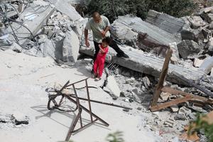 (250512) -- HEBRÓN, mayo 12, 2025 (Xinhua) -- Palestinos son vistos entre escombros después de que excavadoras israelíes demolieran una casa, en la aldea de Idna, en el oeste de la ciudad cisjordana de Hebrón, el 12 de mayo de 2025. (Xinhua/Mamoun Wazwaz) (oa) (ah) (ce)