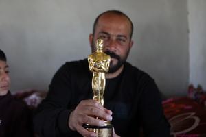 (250421) -- HEBRON, 21 abril, 2025 (Xinhua) -- Imagen del 19 de abril de 2025 del cineasta palestino, Hamdan Ballal, codirector del documental ganador del Oscar "No Other Land", sosteniendo su estatuilla del Oscar en su casa, en la aldea de Susya, en Masafer Yatta, en el sur de Hebrón. El vínculo de los palestinos con su tierra es profundo y nunca abandonarán su hogar, ni siquiera en tiempos de penurias y la creciente violencia de los colonos israelíes, afirmó Hamdan Ballal, codirector del documental ganador del Oscar "No Other Land". "No Other Land" narra la violencia que sufren los aldeanos palestinos y las demoliciones israelíes de viviendas palestinas en la zona de Masafer Yatta, en el sur de Cisjordania. Ha sido galardonado con premios en festivales y con el Oscar al mejor largometraje documental este año. (Xinhua/Mamoun Wazwaz) (rtg) (ah) (vf)